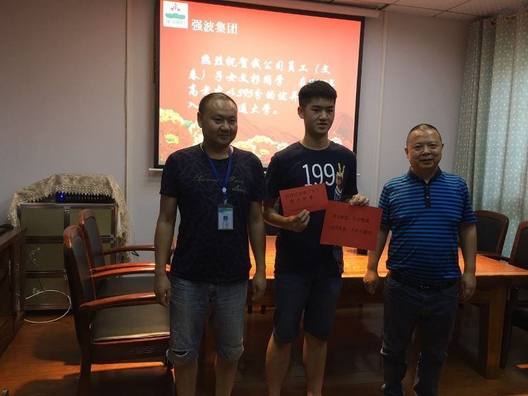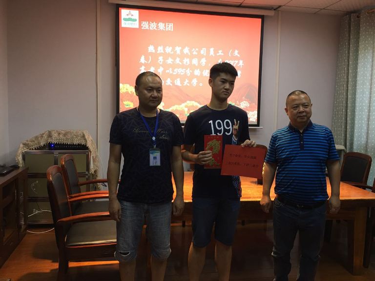 2017年7月25日下午,在強波公司會議室舉行了員工子女高考獎勵基金頒發(fā)儀式。十年樹木,百年樹人,為鼓勵員工重視子女教育,公司董事長孫波專門設(shè)立員工子女高考獎勵基金。今年,員工文春的子女文杉享受到了高考獎勵基金。 公司領(lǐng)導(dǎo)以及全體員工,對考取高等學(xué)府的文杉表示衷心的祝賀!同時,也對考取大學(xué)的文杉家長表示衷心的祝賀!并感謝員工文春為企業(yè)的發(fā)展所付出的辛勤勞動,勉勵學(xué)子們胸懷社會、胸懷天下,努力學(xué)習(xí),奮發(fā)有為,在不久的將來,用自己的智慧,為社會創(chuàng)造更高的價值。